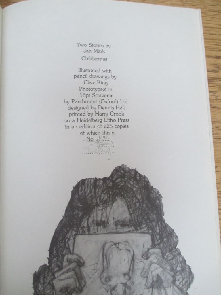 This callousness towards her creations, the ‘splinter of ice’ that Graham Greene said lurked in the heart of every writer, was already evident in her chilling sort story ‘Childermas’, a haunting tale of horror and revulsion. It was included in Two Stories by Jan Mark, in a limited edition of 225 copies published in 1984 by Dennis Hall’s Inky Parrot Press; the second story was a suburban psychodrama enacted by a pair of dolls, ‘Mr and Mrs Johnson’.