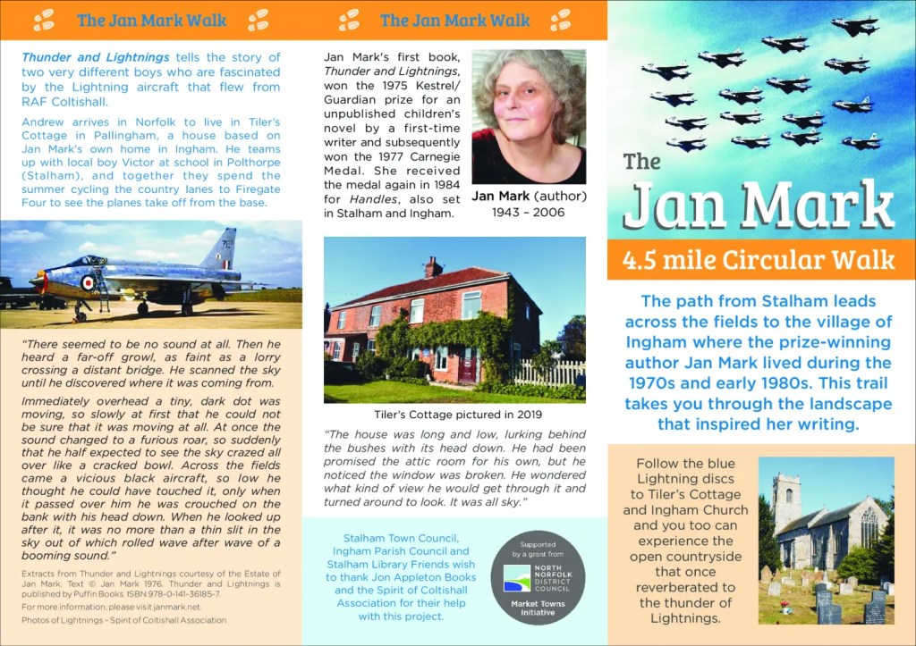HOLD THE DATE! 2026 marks the 20th anniversary of Jan’s death and the 50th anniversary of the publication of her debut, Thunder and Lightnings. On 20 June 2026 (just before her birthday) a group of us will be completing the JAN MARK WALK in Norfolk, expertly guided by locals Phil and Sally who devised the walk. There will be a book swap, a session in a local pub afterwards, possibly – if I can organise it – a film (or part of a film), and possibly, too, a new edition of an old book to add to your collection. We will organise transport to and from Norwich Station to Ingham, the village where Jan lived for many years. If you are interested, please email me at jonappletonsbooks [@] gmail.com and I’ll keep you updated.