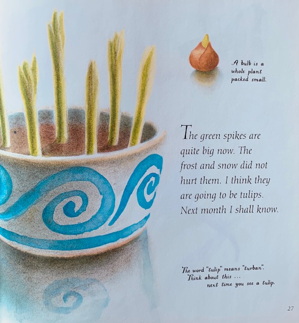 At last it’s officially spring in the northern hemisphere, which always puts me in mind of Jan’s garden – and her wonderful picture book, This Bowl of Earth, illustrated by Gaye Shephard. The book takes us through a year in Jan’s garden. It was published by Walker Books in 1993 as part of their ‘Read and Wonder’ non-fiction picture book series.